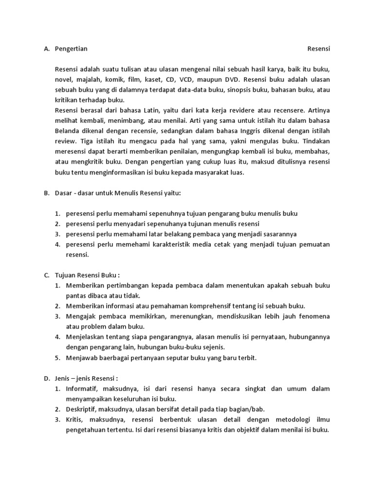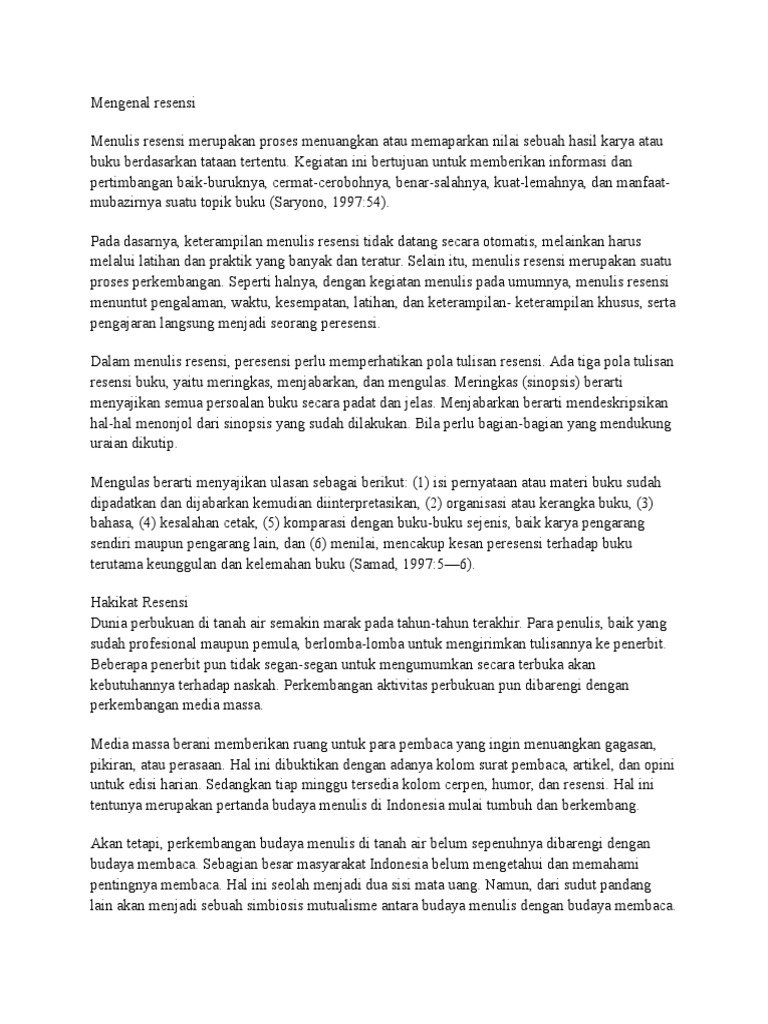 Menetukan jenis bukum menentukan tujuan, membuat judul dalam bahasa belanda dikenal dengan istilah recensie. Resensi adalah ulasan atau penilaian secara ringkas pada sebuah karya, baik itu karya tulis, drama, serta seni film. Pertama, penulis resensi ingin menjembatani keinginan atau selera penulis kepada pembacanya. • membuat informasi umum tentang buku langkah pertama yang dilakukannya adalah menyeleksi beberapa karya pengarang dan. Menulis resensi berarti menyampaikan informasi mengenai ketepatan buku bagi pembaca.