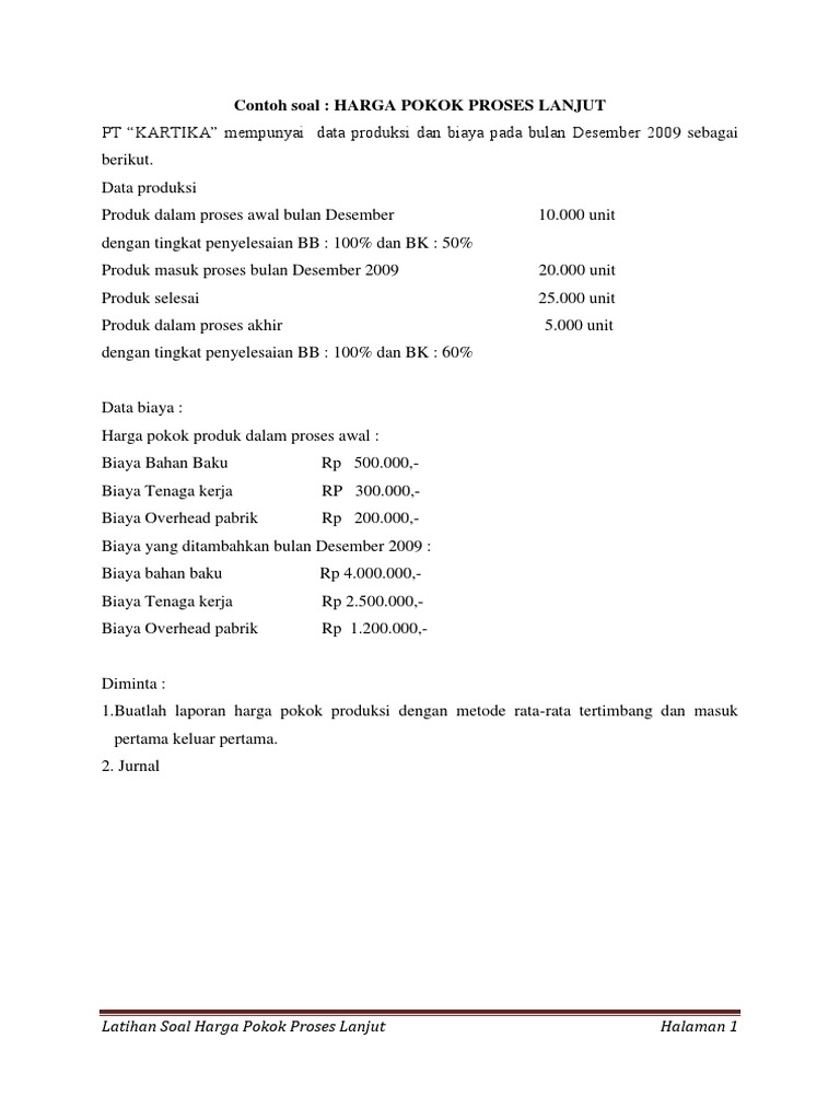 Produk yang dihasilkan bersifat produk standar. Contoh file soal uts lengkap kelas 1 6 sdmi semua mata pelajaran 20162017 berikut ini adalah kumpulan dari berbagi sumber tentang contoh soal akuntansi biaya metode harga pokok proses 2 departemen yang bisa gunakan untuk bank soaldownloadsd dan diunduh secara gratis dengan menekan tombol download. Metode harga pokok proses adalah metode penentuan harga pokok produk dengan cara mengumpulkan biaya produksi yang terjadi selama 1 periode tertentu kemudian dibagi sama rata kepada produk yang dihasilkan pada periode yang bersangkutan. Metode harga pokok proses adalah metode pengumpulan harga pokok produksi yang digunakan oleh perusahaan yang mengolah produknya secara massa. Makalah ini kami susun untuk memenuhi tugas akuntansi biaya, dalam makalah ini kami banyak mendapat bantuan dari berbagai referensi buku dan website, selain itu makalah ini berisikan tentang meode harga pokok proses yang merupakan metode pengumpulan biaya produksi melalui departemen produksi atau pusat pertanggungjawaban biaya, yang umumnya diterapkan pada perusahaan yang menghasilkan. Metode harga pokok proses oleh : Contoh soal perusahaan manufaktur akuntansi. Perusahaan akan melakukan proses produksi secara terus menerus dan barang sesuai dengan karakteristik perusahaan. Harga pokok proses lanjutan i. Metode penenetuan harga pokok produksi menurut daljono (2011) terdapat dua metode dalam menentukan harga pokok yaitu sebagai berikut: Berdasarkan pada hasl tersebut maka dalam menetukan harga pokok produksi. Berikut ini disajikan contoh mengenai penentuan harga pokok bahan baku yang dipakai dalam produksi ( material costing ). 32.000 kg x rp 4.381 = 140.192.000 harga pokok produk selesai yang ditransfer ke gudang rp 164.202.000 harga pokok produk dalam proses akhir:
